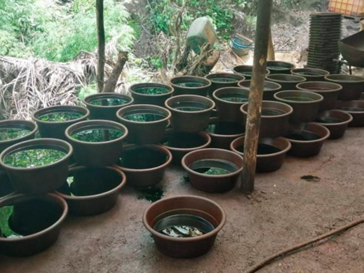 En zona rural de Sardinata, el Batallón de Operaciones de la Fuerza de Tarea Vulcano del Ejército Nacional logró desmantelar dos laboratorios de procesamiento de drogas. En un operativo que se realizó en la vereda San Cruz de ese municipio, se encontraban almacenados 660 galones de hoja de coca picada, 245 litros de ACPM y 40 más de gasolina, de propiedad del Ejército de Liberación Nacional, ELN.